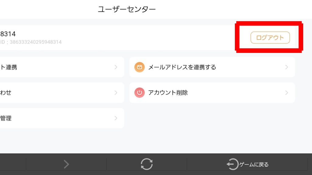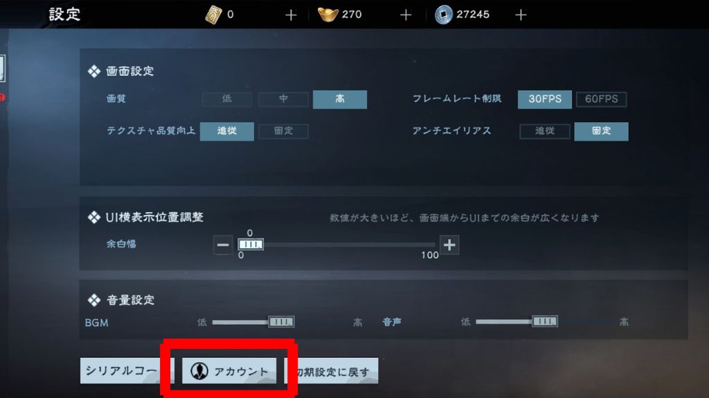 右下のメニュー、歯車マークから設定画面を表示して「アカウント」をタップします。