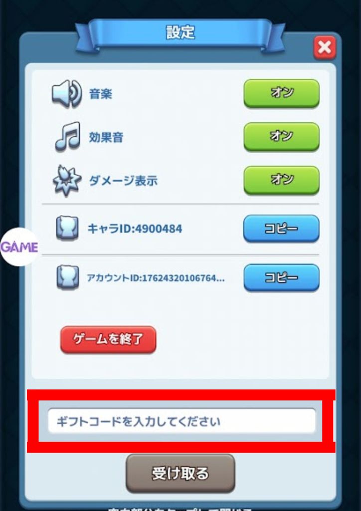 ギフトコードを入力します。入力後、確定することで報酬を獲得できます。
