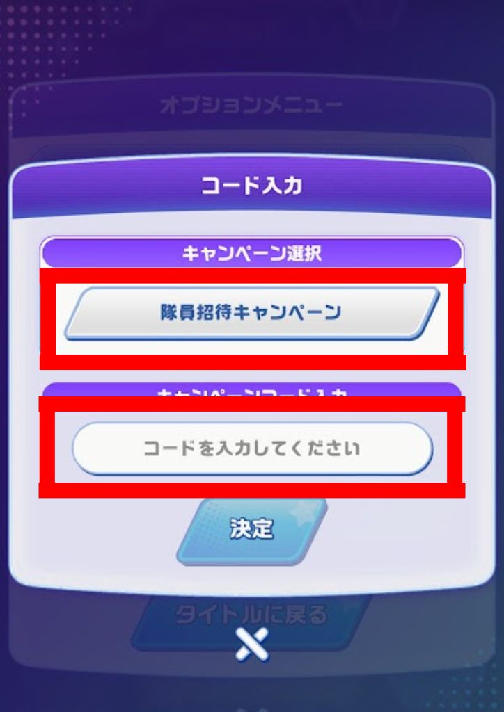 - キャンペーン選択とコードの入力