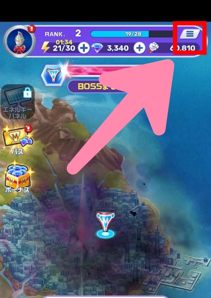ホーム画面の右上のメニューをタップします。